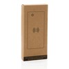 Power bank 8000 mAh, ładowarka bezprzewodowa 5W, 4 diody wskazujące poziom naładowania, obudowa wykonana z bambusa z certyfikatem FSC® (Forest Stewardship Council), wbudowany akumulator litowo-polimerowy klasy A, bezprzewodowe ładowanie jest kompatybilne ze wszystkimi urządzeniami posiadającymi możliwość ładowania indukcyjnego, wejścia micro USB i USB typu C 5V/2A, wyjścia USB i USB typu C 5V/2A, wyjście bezprzewodowe 5V/1A, kabel z TPE z recyklingu bez dodatku PVC w komplecie, w pudełku z certyfikatem FSC® mix, nie zawiera PVC, ślad węglowy produktu: 3,66 kg CO2