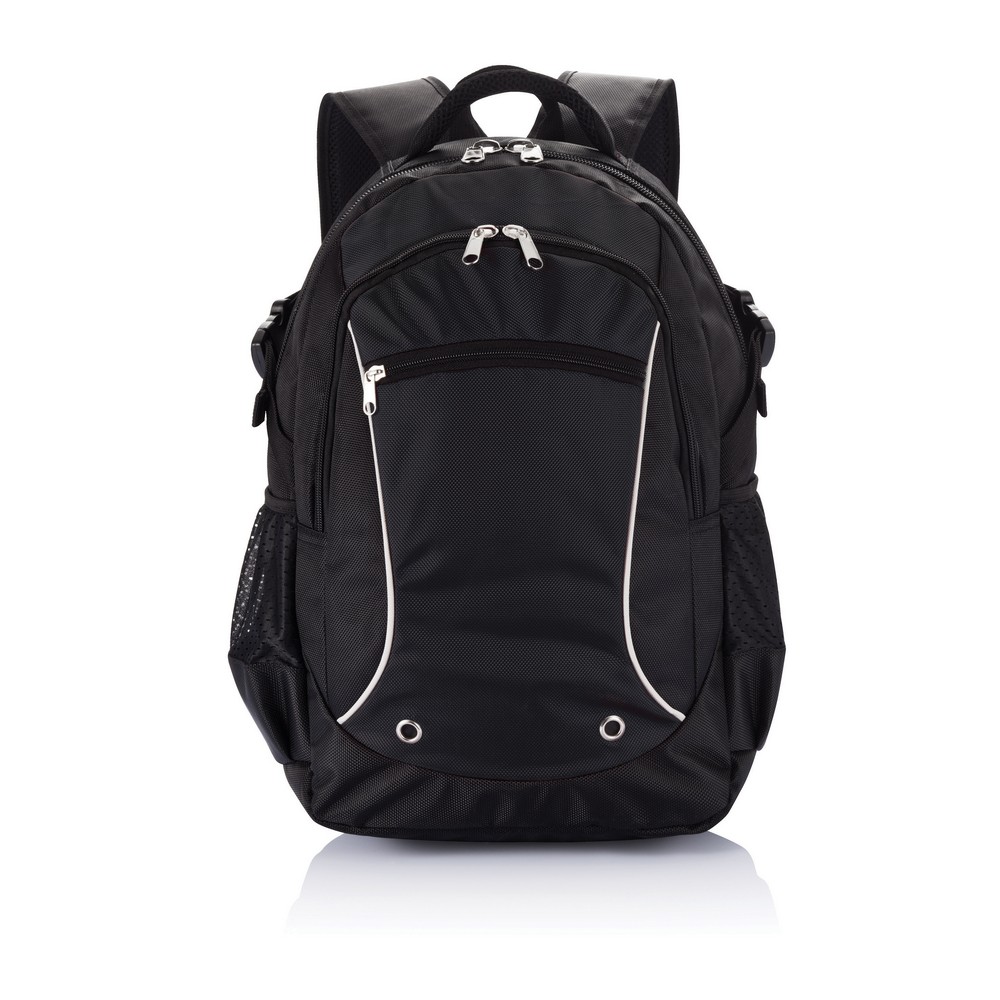 Plecak na laptopa 15,6", wykonany z poliestru 1680D i żakardu, przednia kieszeń z organizerem na zamek błyskawiczny, przegroda główna na laptopa do 15,6", odblaskowe elementy, siateczkowe kieszonki po obu stronach, nie zawiera PVC, ślad węglowy produktu: 7,77 kg CO2