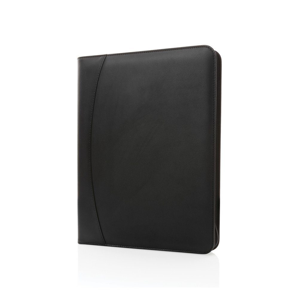 Teczka konferencyjna A4 z notatnikiem (20 kartek z 64 g/m2 papieru z recyklingu w linie), zamykana na zamek błyskawiczny, wewnątrz kieszeń i stojak na telefon, 2 kieszenie na wizytówki i pętla na akcesoria do pisania, wykonana w 100% z PU z recyklingu z certyfikatem RCS (Recycled Claim Standard) który gwarantuje, że wykorzystane materiały pochodzą z recyklingu, całkowita zawartość materiału z recyklingu obliczona w oparciu o wagę całkowitą przedmiotu: 14%, nie zawiera PVC
