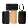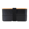Pudełka śniadaniowe 2 w 1, 2 pojemniki o pojemności 500 ml, w komplecie znajduje się: widelec, nóż oraz łyżka, wieczko jednego z pojemników posiada bambusową górną część, wieczko drugiego pojemnika z miejscem na sztućce, pojemniki połączone elastycznym paskiem, produkt wykonany z PP, bambusa oraz gumy